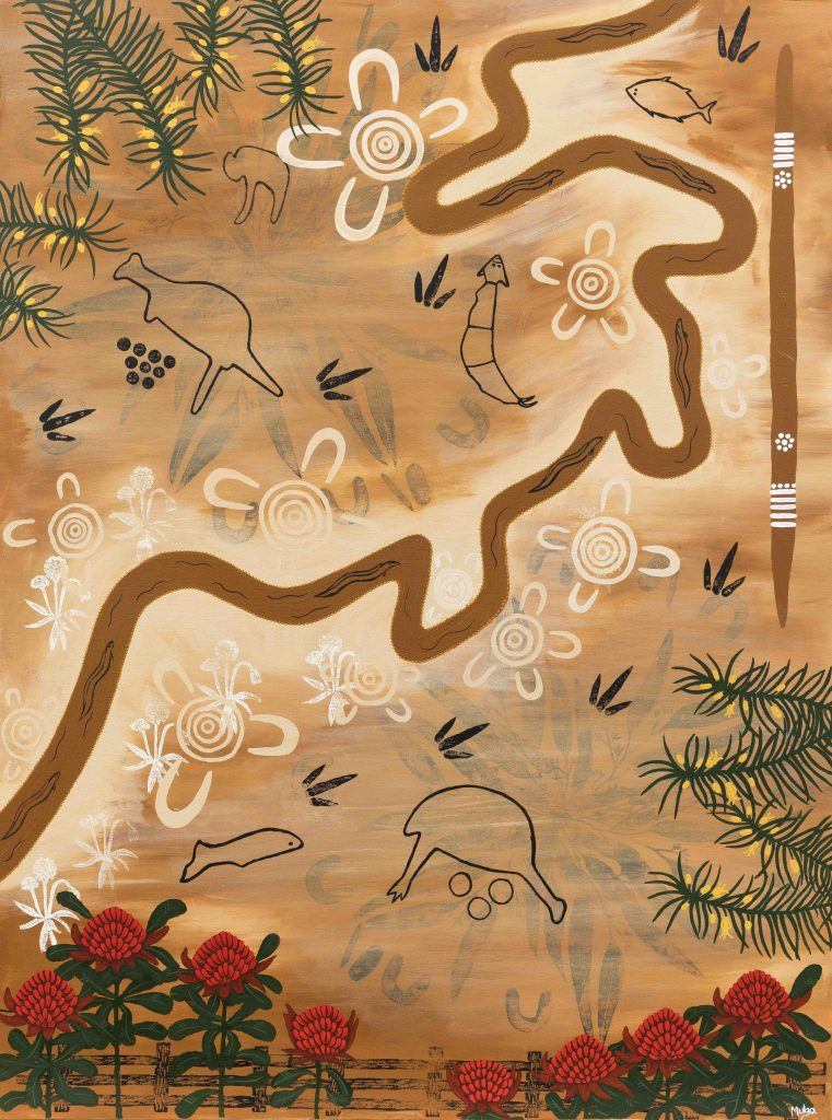 Assistance from the Australian Government through the Australia Council for the Arts, its arts funding and advisory body and Musuems and Galleries NSW, enabled the commissioning of project artwork from Leanne Mulgo Watson, Marri Badu Muru – Big Water Path (above ) and Wiyanga Badu – Mother Water (below) and production of the 11 audio walks, culminating in an exhibition opened in September 2023 at Hawkesbury Regional Museum. The 11 audio walks are hosted on Hawkesbury Regional Museum‘s website, and will be streamable via QR code from 11 sign posted sites along the river.